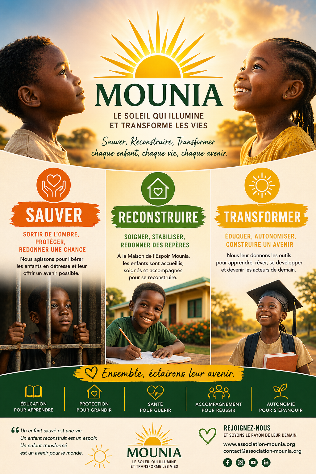 Ensemble, Vers un Avenir Rayonnant Nous vous invitons à nous rejoindre dans cette aventure radieuse. Ensemble, nous pouvons faire briller la lumière sur des opportunités nouvelles, sur des idées qui changent des vies et sur une communauté qui prospère."Quand le soleil brille, tout semble possible." Avec Mounia, nous embrassons cet espoir et travaillons chaque jour pour qu'il devienne réalité. Merci de nous rejoindre dans cette aventure qui réchauffe les cœurs et éclaire le chemin vers un futur meilleur.
